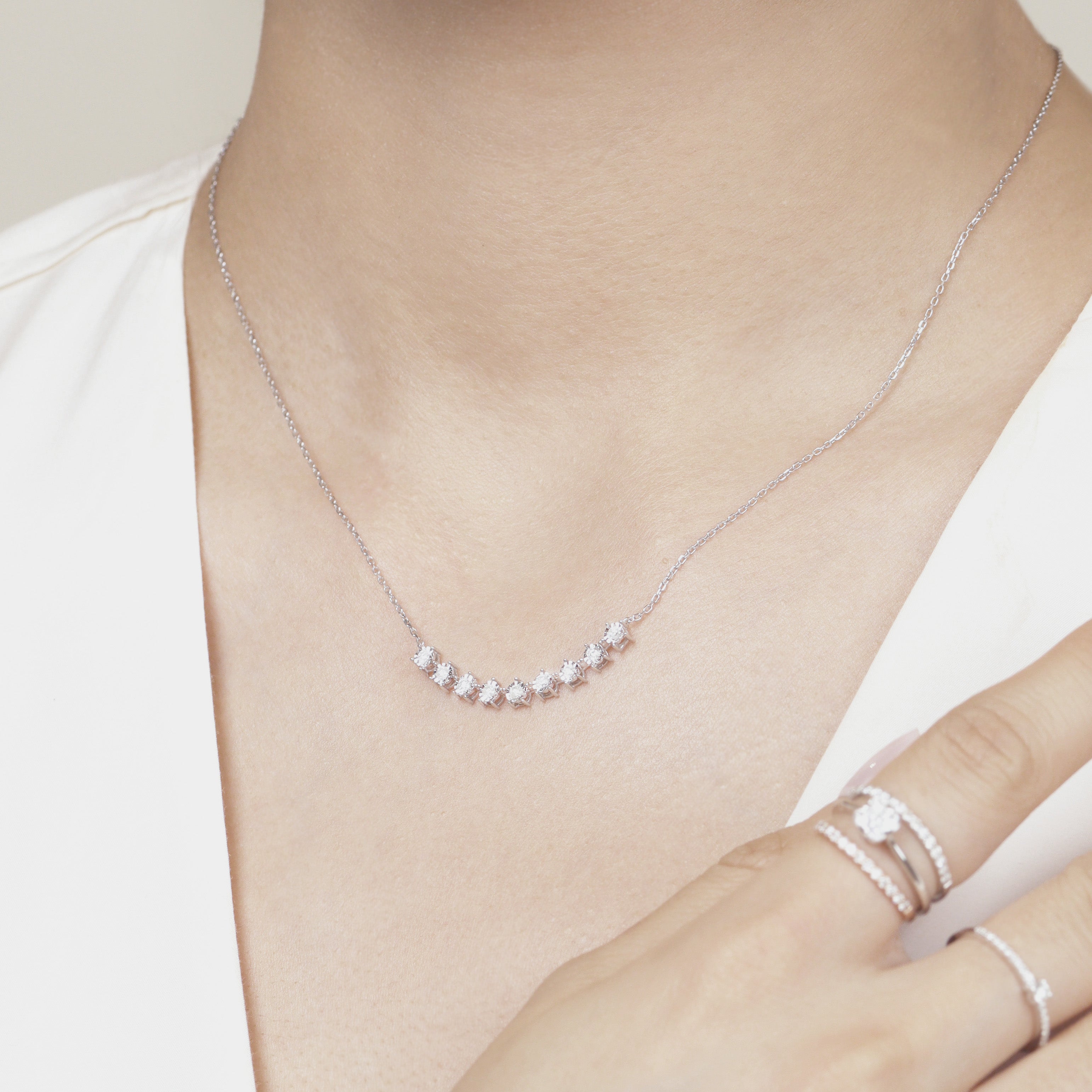 Introducing Faber's 18K Gold Round Brilliant Diamond Illusion Necklace, an exquisite piece that combines modern design with timeless elegance. Featuring 0.28 carats of beautifully cut round brilliant diamonds in a captivating illusion setting, this necklace is designed to enhance the appearance of the diamonds, making them appear larger and more radiant. Crafted in 18K white gold, the delicate arrangement of diamonds creates a graceful arc that sits perfectly along the neckline. Whether for a special occasion or adding subtle sophistication to your everyday look, this necklace is a true embodiment of refined luxury. Elevate your jewellery collection with this stunning piece from Faber.