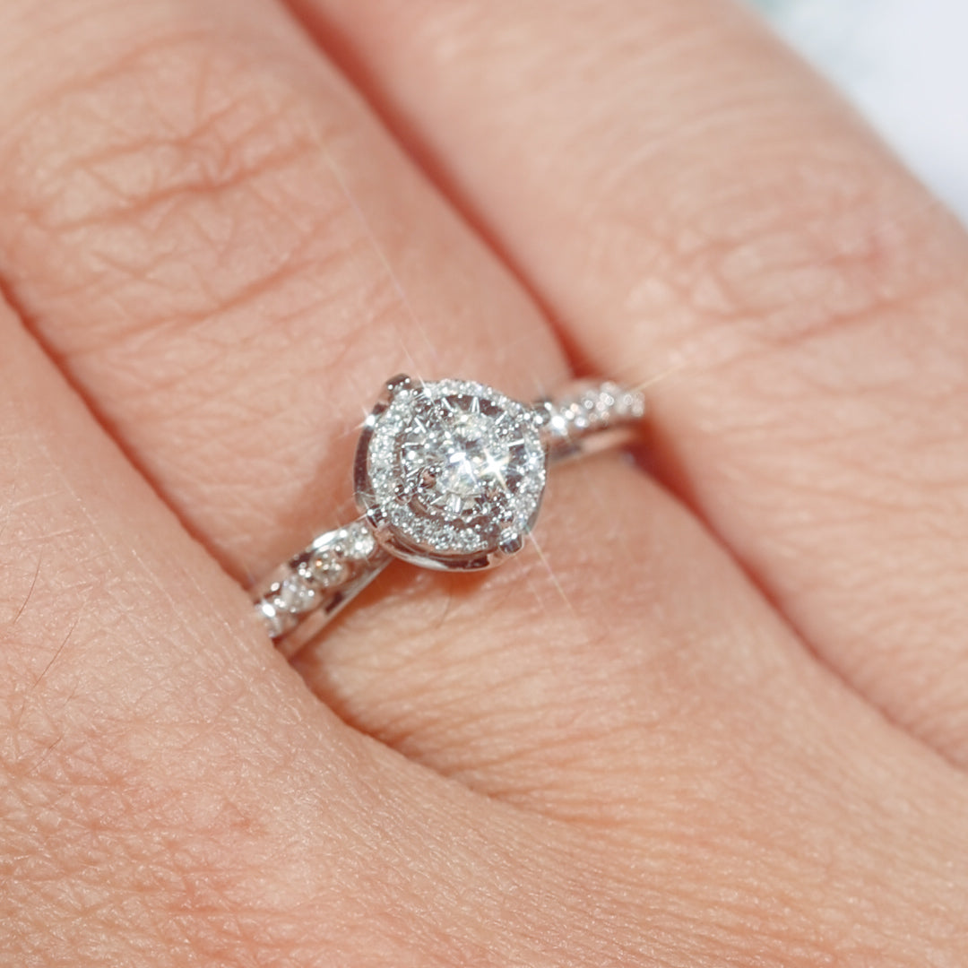 Delicately crafted in 18K gold, the Lumière ring features a brilliant 0.27ct total diamond weight set in a pavé halo design. At its heart, a cluster of natural round brilliant diamonds is expertly arranged to create the illusion of a singular radiant centre — encircled by a fine diamond band that catches the light with every gesture.