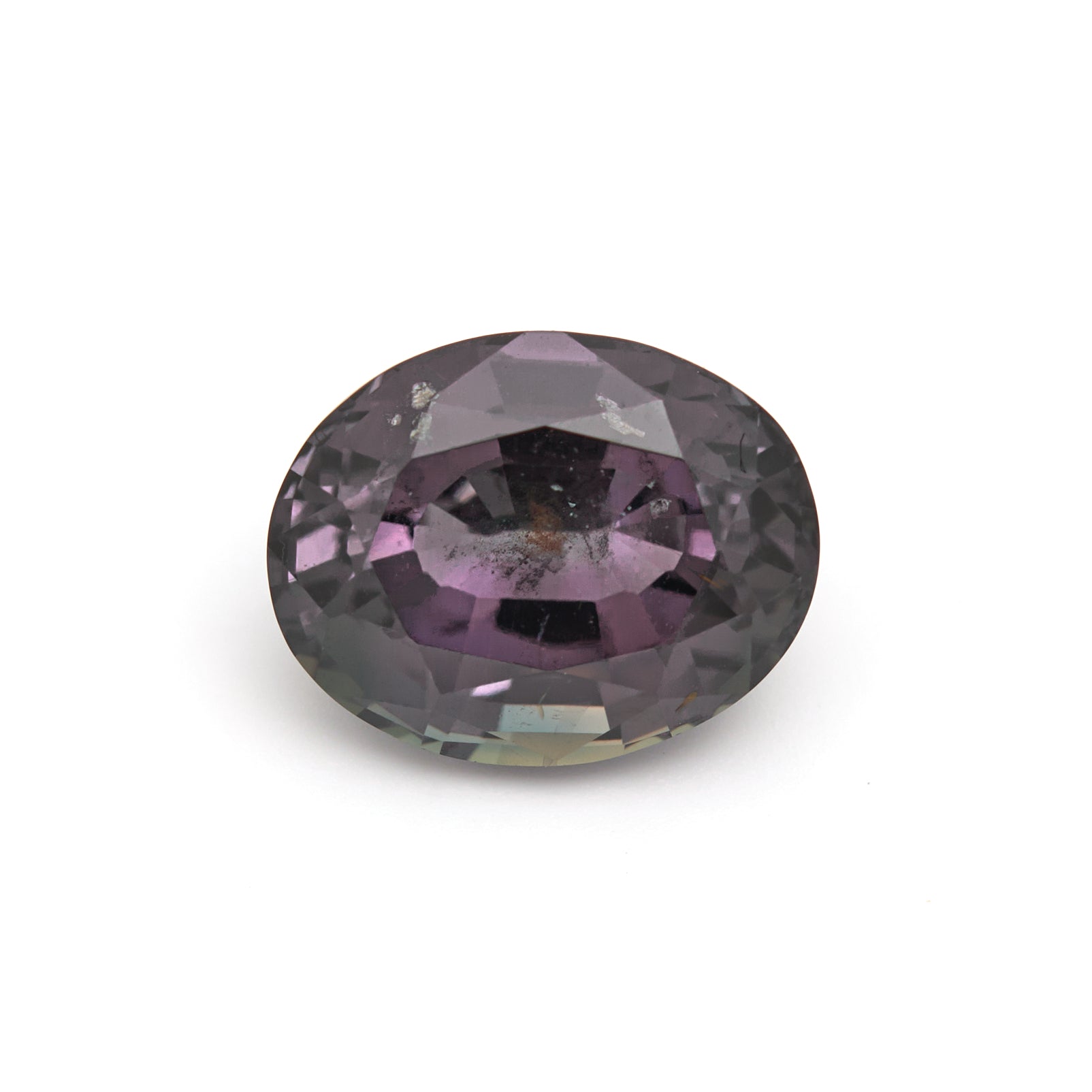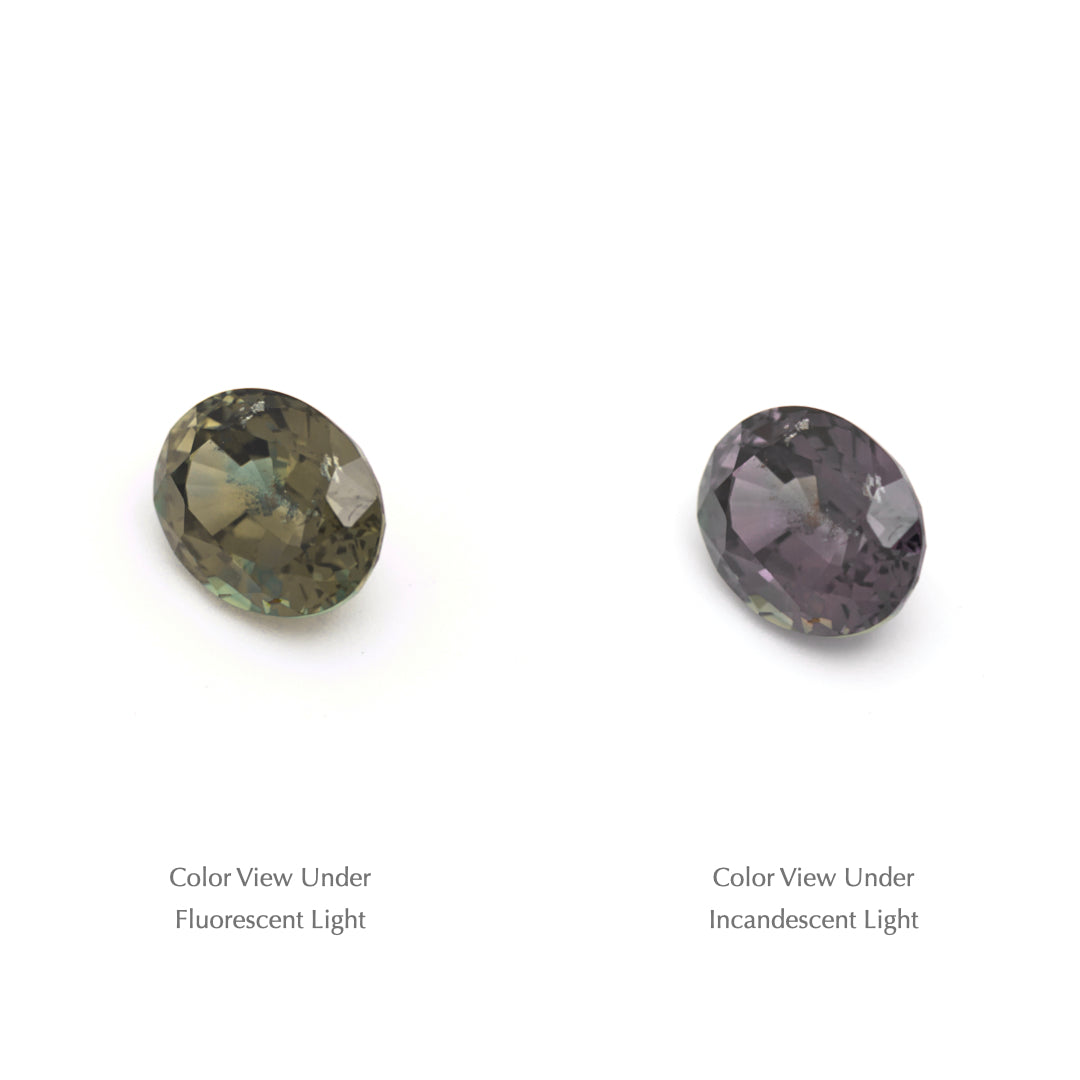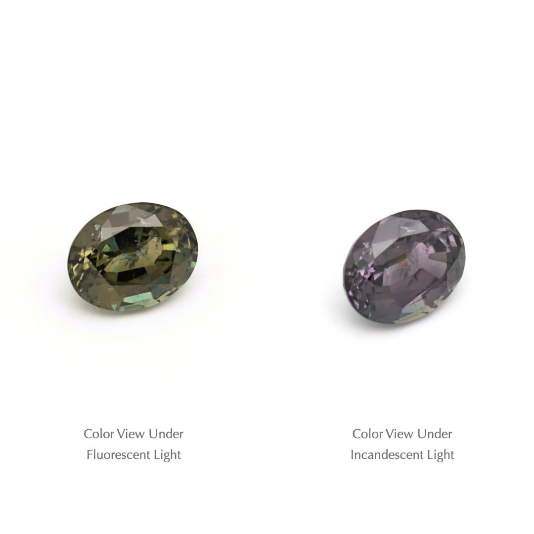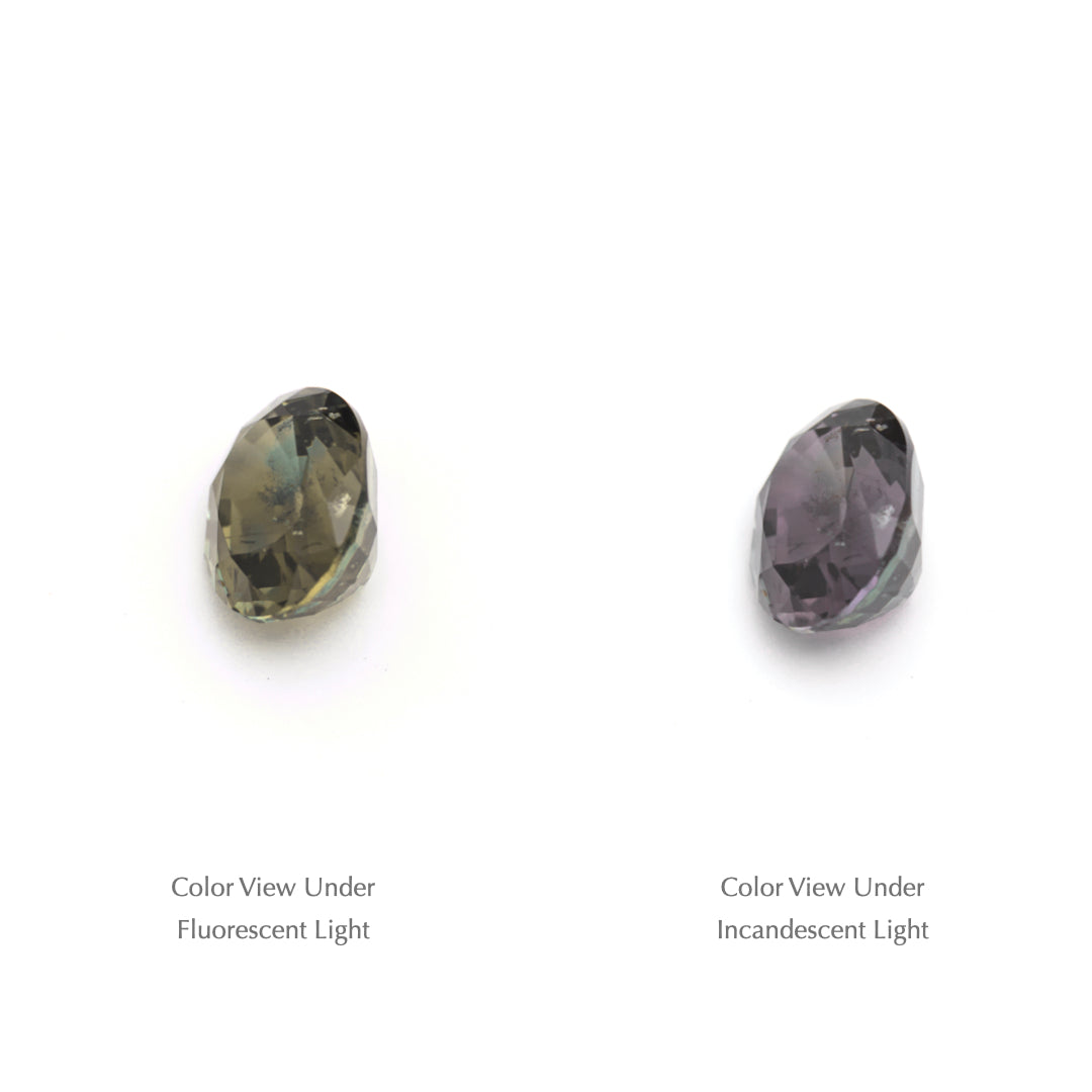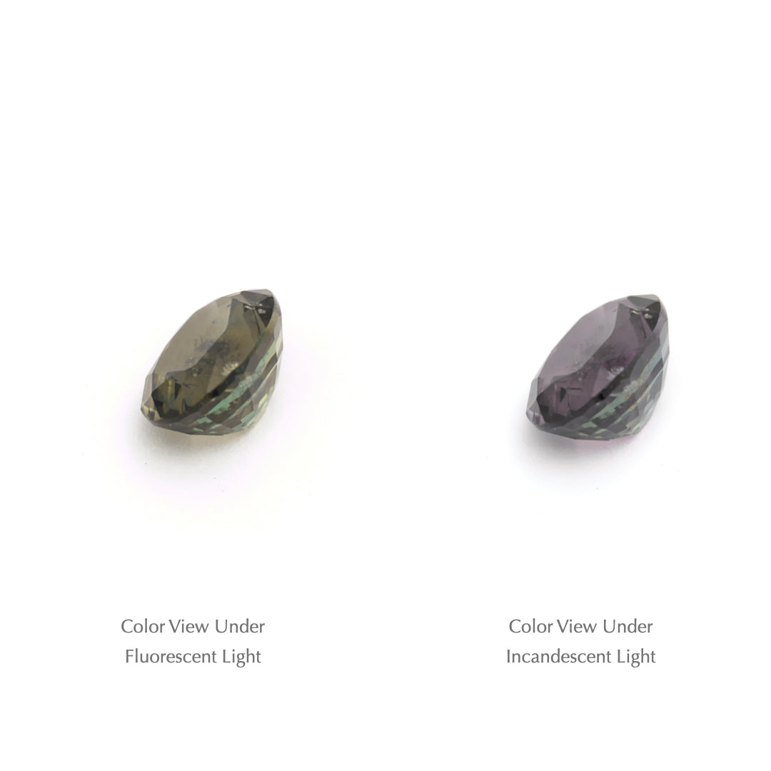 A remarkable 2.24 carat color change sapphire exhibiting a stunning transformation from olive green under fluorescent light to a regal purplish-violet under incandescent lighting. This natural oval-cut gemstone offers an exceptional visual experience with every shift in light source. Its distinctive personality and rarity make it a prized choice for custom fine jewellery or collectors seeking something truly unique. A natural wonder, full of intrigue and elegance.