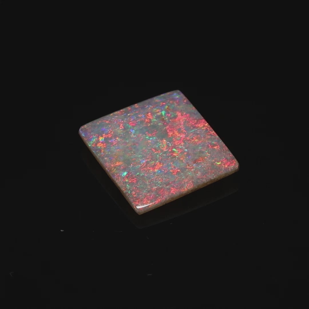 The pinfire pattern, known for its evenly distributed specks of vivid color, adds depth and character to the opal, perfectly complemented by its sleek and polished square shape. This unique gemstone is ideal for bespoke jewellery designs, such as a contemporary pendant or a striking ring, where its play-of-color can shine.