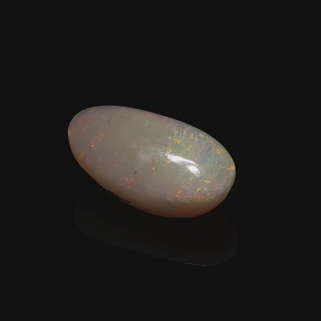 This elegant 6.01-carat white opal originates from the famous opal fields of Coober Pedy, Australia. Known for its exceptional play-of-color, this opal features a captivating rainbow spectrum, blending vibrant flashes of red, orange, green, blue, and violet hues across its polished surface.