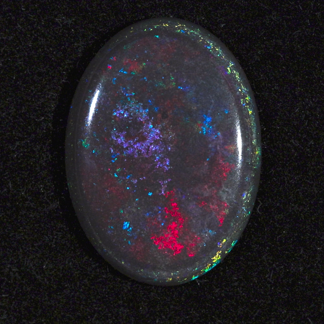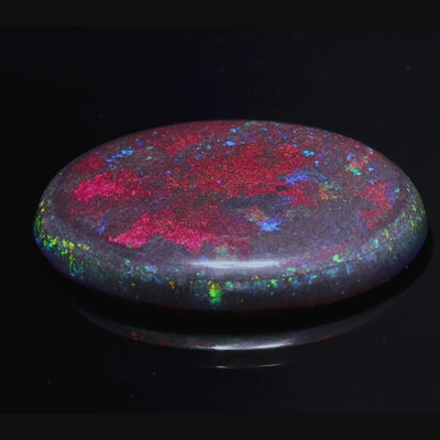 The opal's natural surface is adorned with a play of color unlike any other, resembling a galaxy of vibrant hues suspended in stone. Its broad flashes of red—a highly sought-after feature—contrast dramatically against the deep, dark base, making the colors dance vividly under light. This unique gem delivers an extraordinary visual experience, perfect for custom jewelry pieces or as the centerpiece of a fine opal collection.