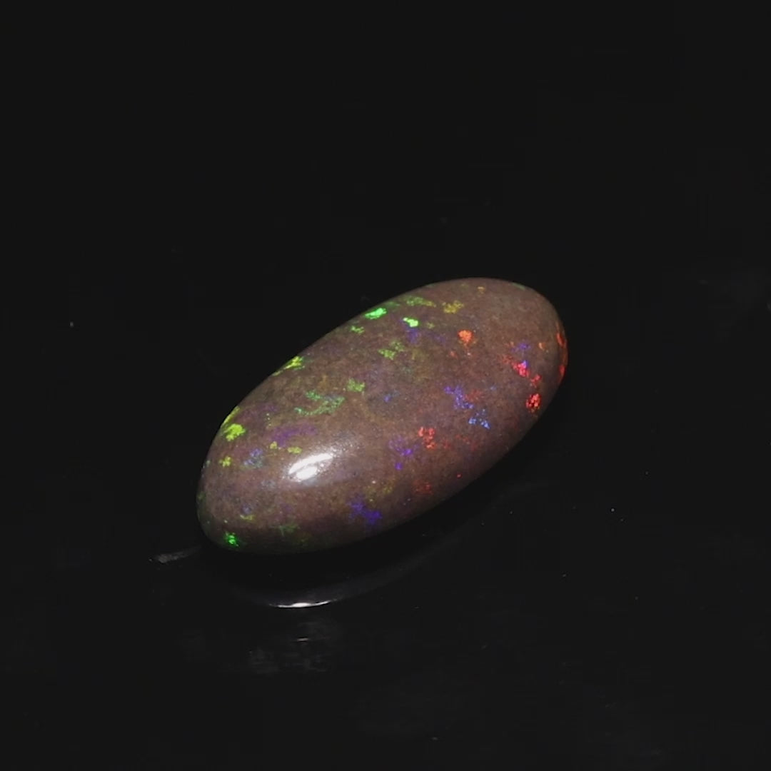 This 5.34-carat opal from Andamooka, Australia, showcases a dazzling array of colors that shimmer across the spectrum. Its polished surface reveals vibrant flashes of red, green, blue, and purple, creating a lively dance of hues under the light.
