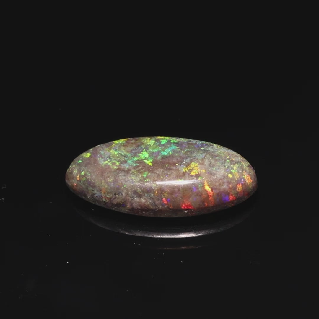 This exquisite 9.04-carat opal from Andamooka, Australia, displays a mesmerizing array of rainbow colors. Its vibrant hues of green, purple, red, and orange shift beautifully under light, showcasing the gemstone's exceptional play-of-color.