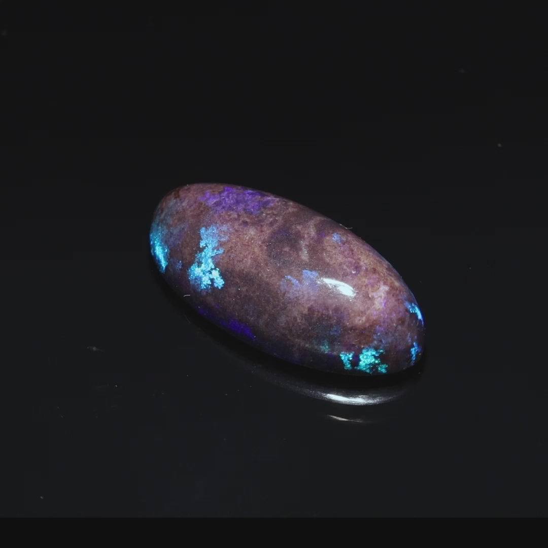 This remarkable opal, weighing 10.45 carats, originates from the renowned Andamooka fields in Australia. Its unique palette of deep blue and violet hues creates a striking and sophisticated aesthetic. The vibrant colors shimmer beautifully across the opal’s surface, showcasing the stone's premium quality.