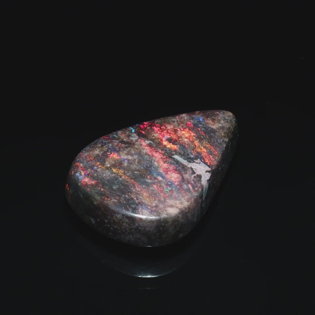 This 15.71-carat opal from Andamooka, Australia, is a stunning showcase of vibrant rainbow colors, making it a true standout. Its polished surface highlights the opal's vivid play-of-color, with streaks of red, blue, orange, and green creating a dazzling visual effect.