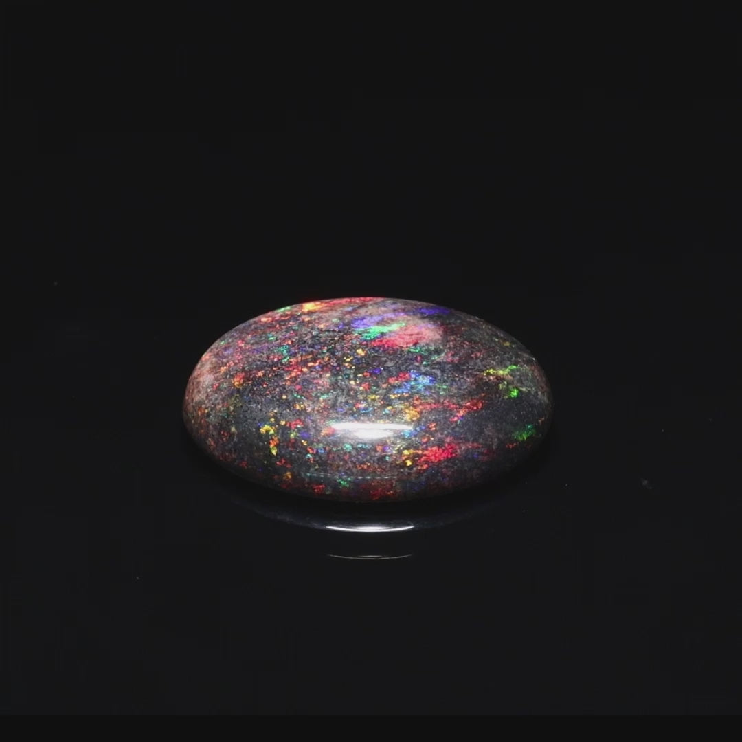 This exquisite 7.35-carat opal hails from Andamooka, Australia, showcasing a vibrant rainbow play-of-color. The opal's surface radiates with a spectrum of hues, including fiery reds, shimmering greens, and deep blues, creating a mesmerizing kaleidoscopic effect. Its polished finish accentuates the gemstone’s natural beauty and unique character.