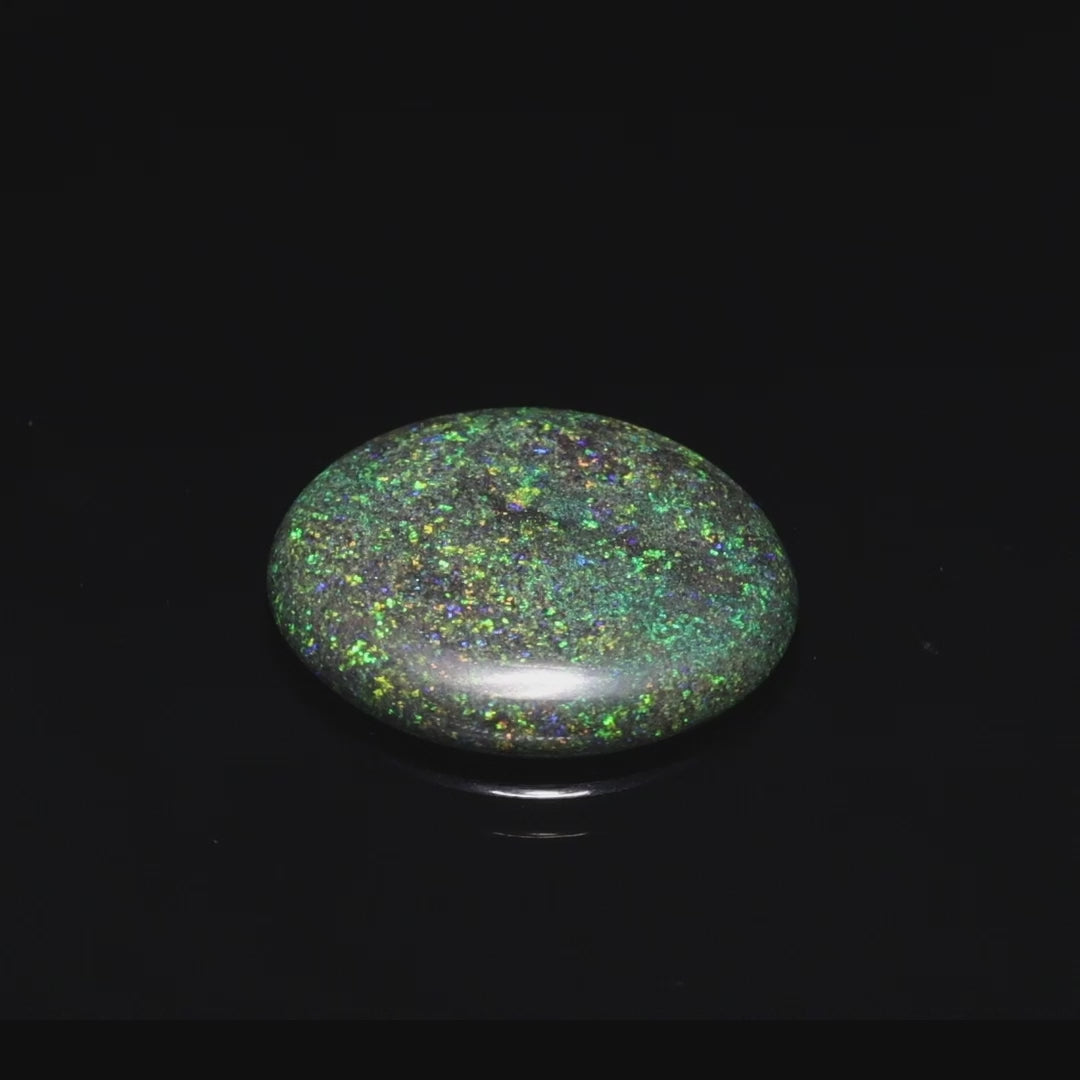 What makes this stone exceptional is its dazzling all-color display. From flashes of vibrant greens and fiery oranges to deep blues and shimmering gold, its rich, iridescent pattern captivates the eye. Set against a dark, speckled backdrop, the colors come alive in a hypnotic play of light, offering new visual delights with every angle. Its finely polished cabochon finish ensures smoothness and enhances its natural luster.