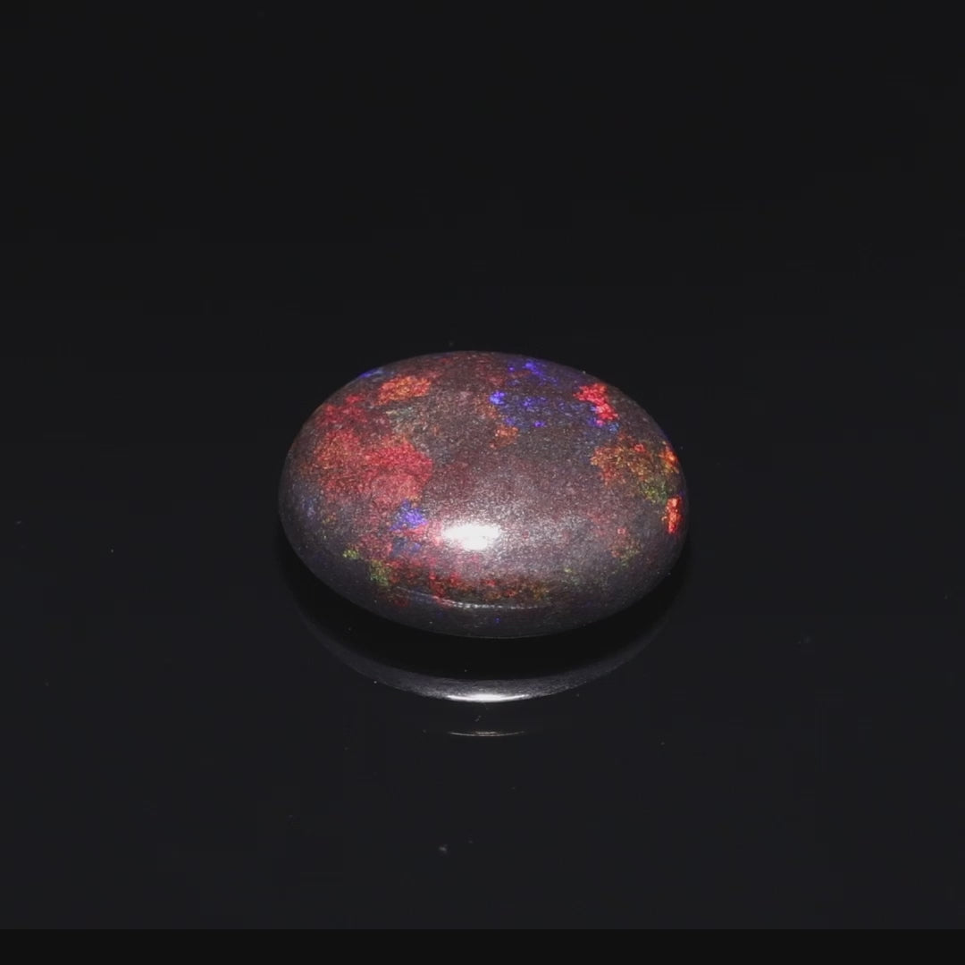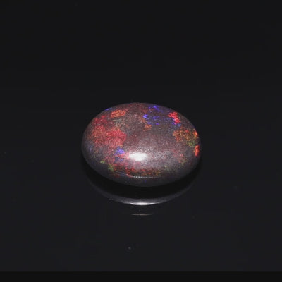 This remarkable 7.76-carat opal from Andamooka, Australia, features a captivating rainbow display with predominantly vivid red hues. The gemstone's surface exudes warmth and brilliance, with flashes of fiery red complemented by subtle hints of blue, green, and orange. Its polished cabochon finish enhances its visual depth and intensity.