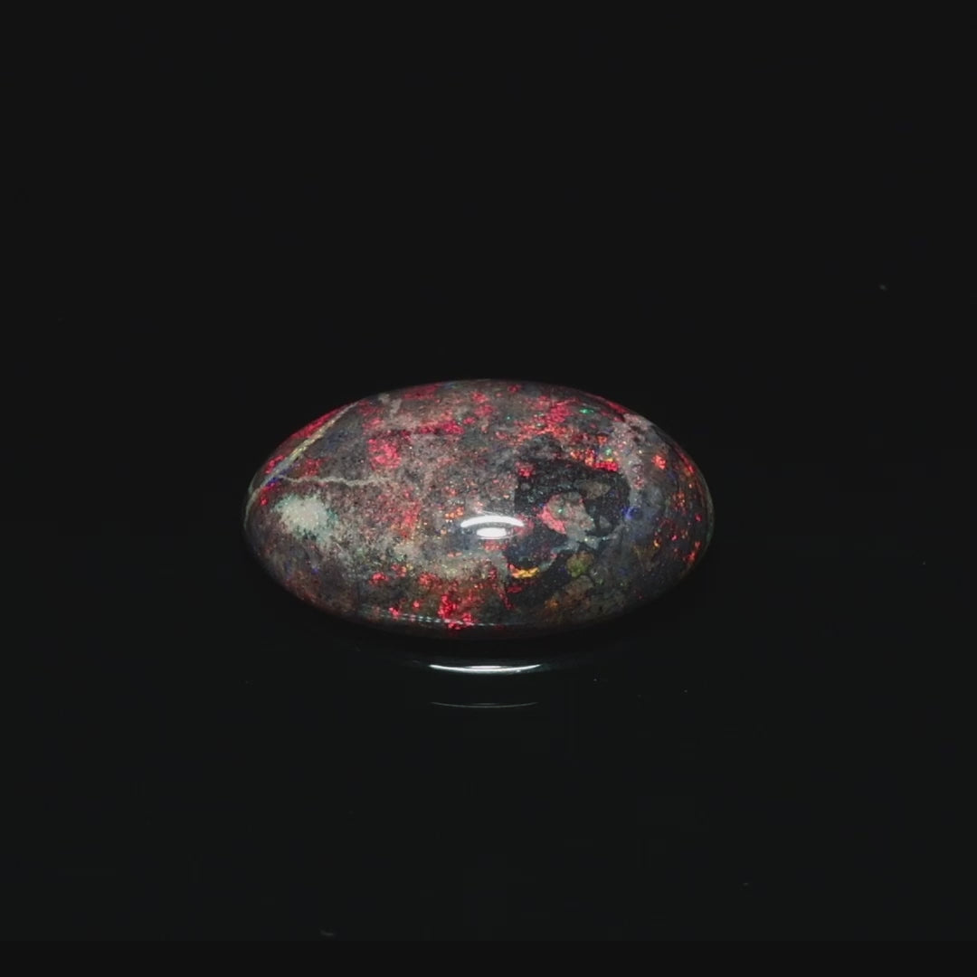 This unique 6.76-carat Andamooka opal boasts a striking rainbow spectrum with vibrant flashes of red, blue, green and gold interwoven into its natural matrix. Its earthy tones contrast beautifully with its fiery play-of-color, creating a harmonious blend of organic beauty and radiant brilliance.