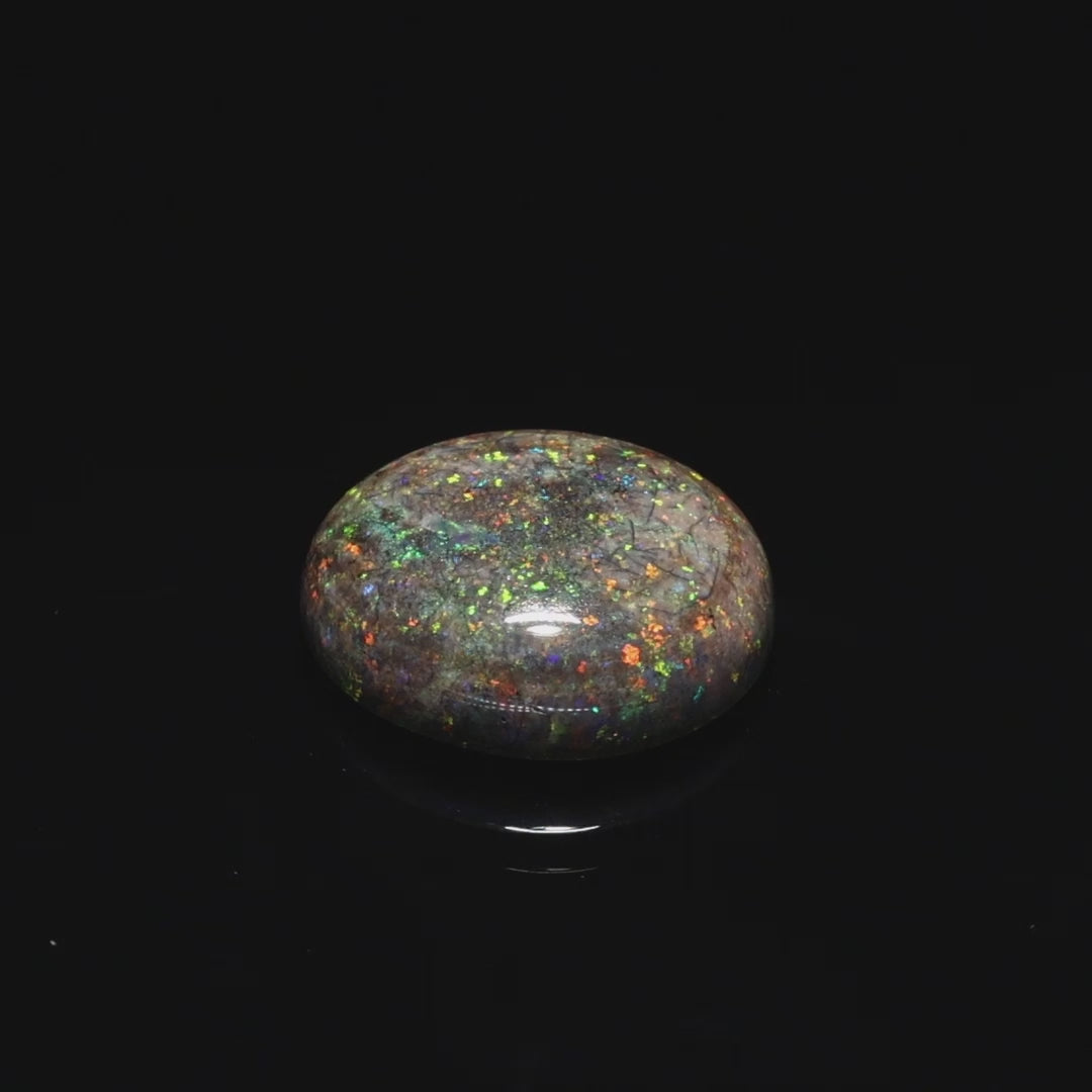 This 9.25-carat Andamooka opal is a stunning representation of nature's artistry, featuring a delicate pinfire pattern that radiates a full rainbow of colors. Vivid flashes of green, blue, orange, and red dance across its surface, creating a dynamic and lively play-of-color.