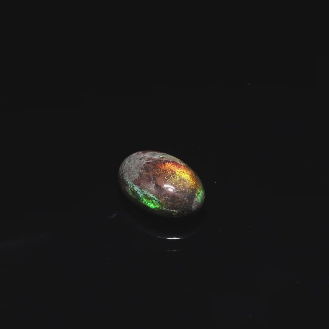 This 2.69-carat Andamooka opal showcases a stunning play of colors, with rainbow hues of green, orange, and golden tones that radiate from within its earthy matrix. Its compact size and vivid fire make it an excellent choice for a unique pendant or ring centerpiece.
