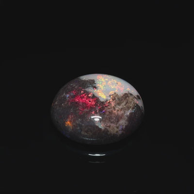 This semi-crystal opal from Andamooka weighs 12.66 carats and features a vivid, fiery red display complemented by a full spectrum of rainbow colors. Its intricate patterns create a mesmerizing "world-like" appearance, making it a standout specimen.