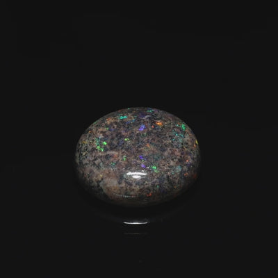 This 11.6-carat opal from Andamooka boasts a distinctive "snow leopard" appearance, characterized by a speckled matrix showcasing vibrant rainbow hues of green, blue, purple, and gold. The unique patterning and natural coloration make it a captivating gemstone, perfect for collectors or as a statement piece in jewelry.