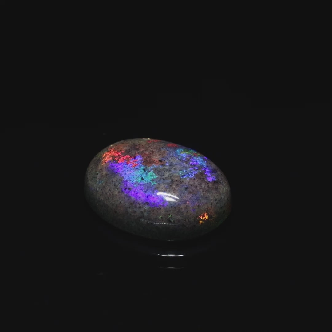 This exquisite 8.69-carat opal from Andamooka displays a vivid array of rainbow colors, including striking blues, purples, fiery reds, and golden hues. The opal’s surface exhibits a mesmerizing play-of-color against its natural speckled base, making it a highly desirable gemstone for collectors and jewelry enthusiasts.