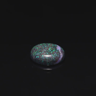 This 4.37-carat Andamooka opal features a striking pinfire pattern in vibrant green tones, reminiscent of a military camouflage palette. The gem's surface shimmers with intense green flashes interspersed with delicate blues, creating a dynamic and captivating visual effect.