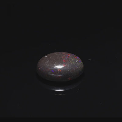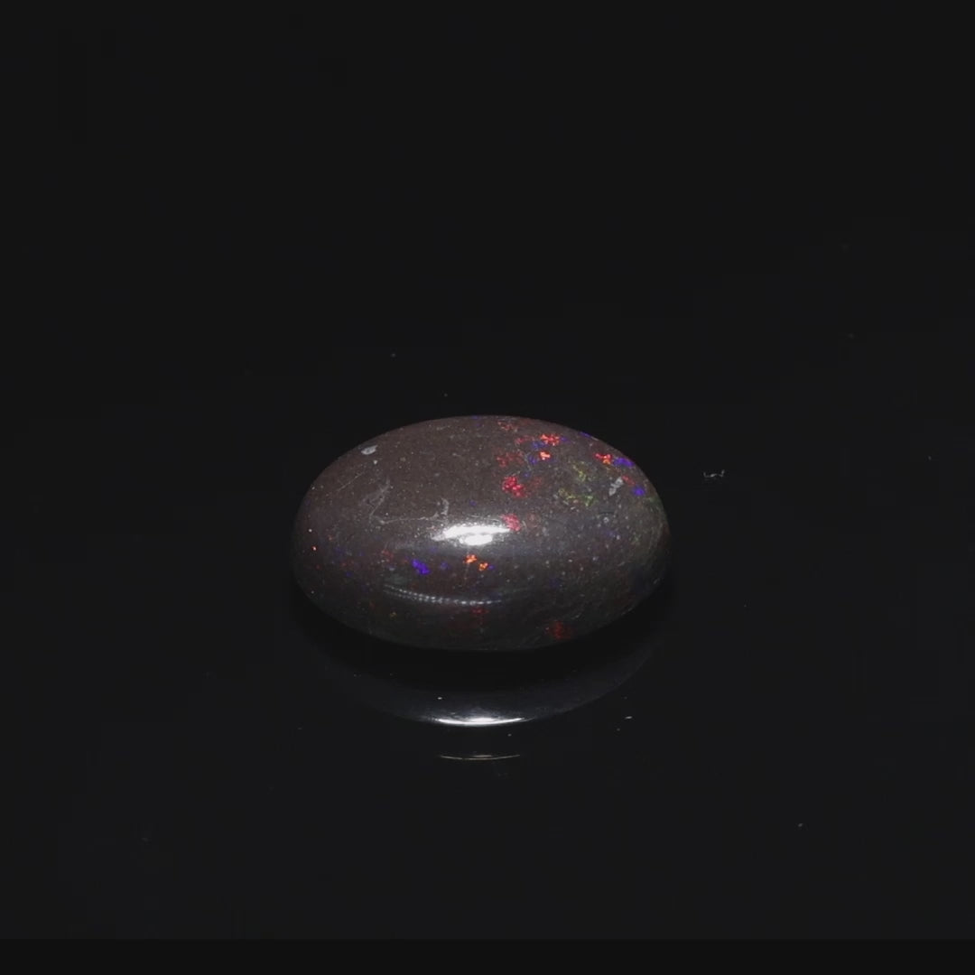This 6.27-carat Andamooka opal exudes a mesmerizing array of colors, featuring vibrant flashes of red, orange, yellow, green and violet against a deep, earthy backdrop. Its polished finish enhances the gem's natural brilliance and its oval shape lends itself beautifully to various jewelry designs.