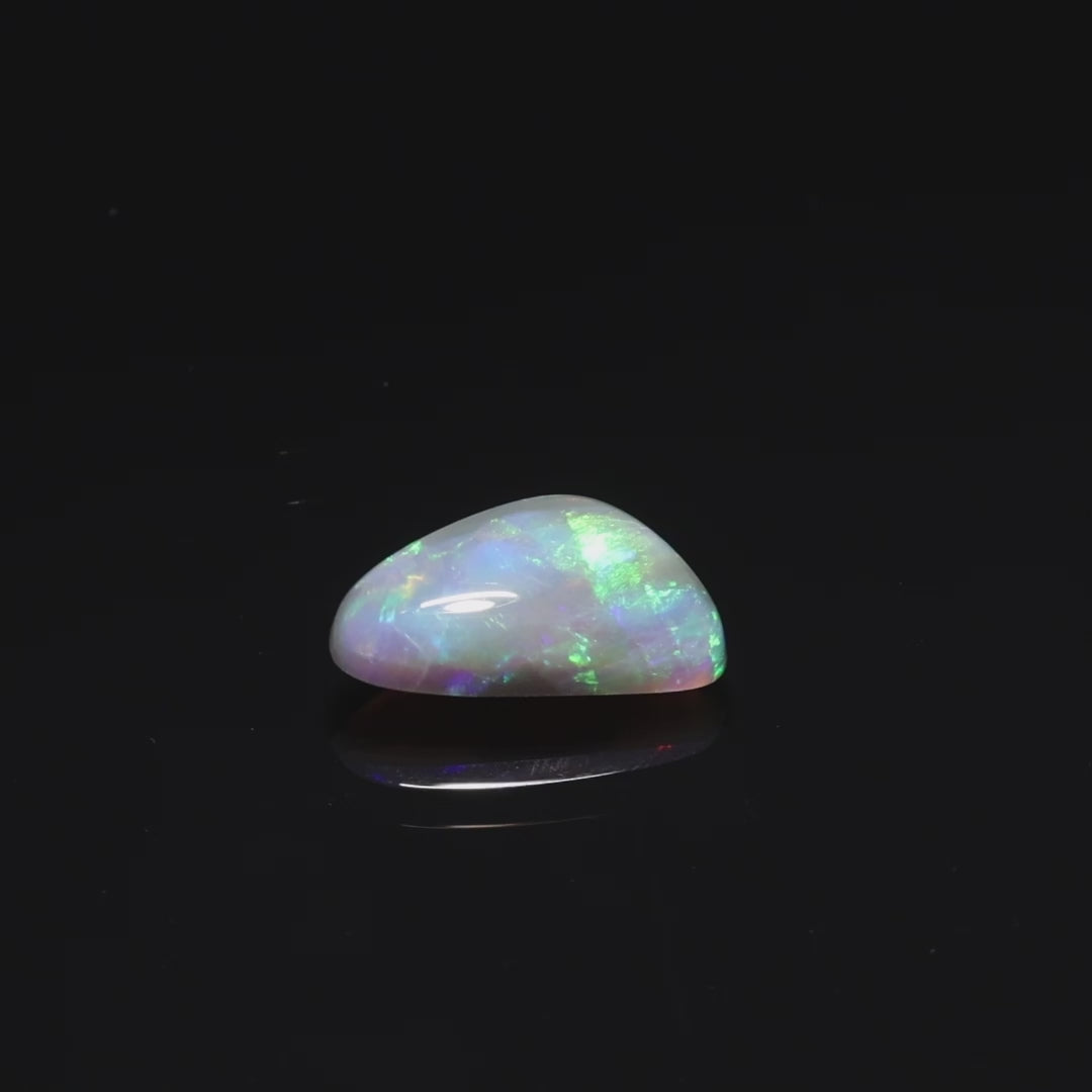 This exquisite 2.98-carat opal from Lightning Ridge, Australia, showcases the rare and coveted harlequin pattern in a vibrant rainbow spectrum. The gemstone features striking flashes of green, blue, and violet with hints of other colors, creating a dynamic and captivating display.