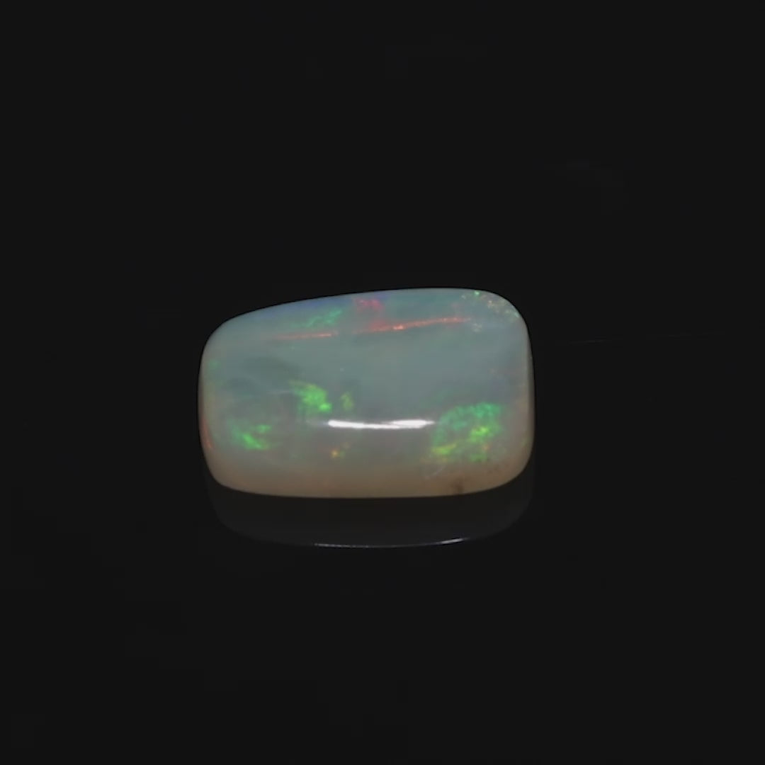 Cut in a classic rectangular cabochon shape, its crystal clarity allows light to dance across the surface, showcasing its vivid spectrum of colors. The opalโs deep black base provides a stunning contrast, enhancing the brightness and intensity of the fiery hues within. Whether viewed under natural light or artificial lighting, this opal radiates an ethereal brilliance that sets it apart.