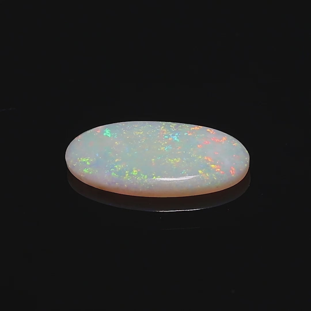 This exceptional 2.05 Ct opal from the renowned Andamooka region in Australia radiates a full spectrum of colors, including flashes of red, green, yellow, blue, and orange. The opal's striking play-of-color dances across its smooth, oval surface, creating a mesmerizing display of light and brilliance.