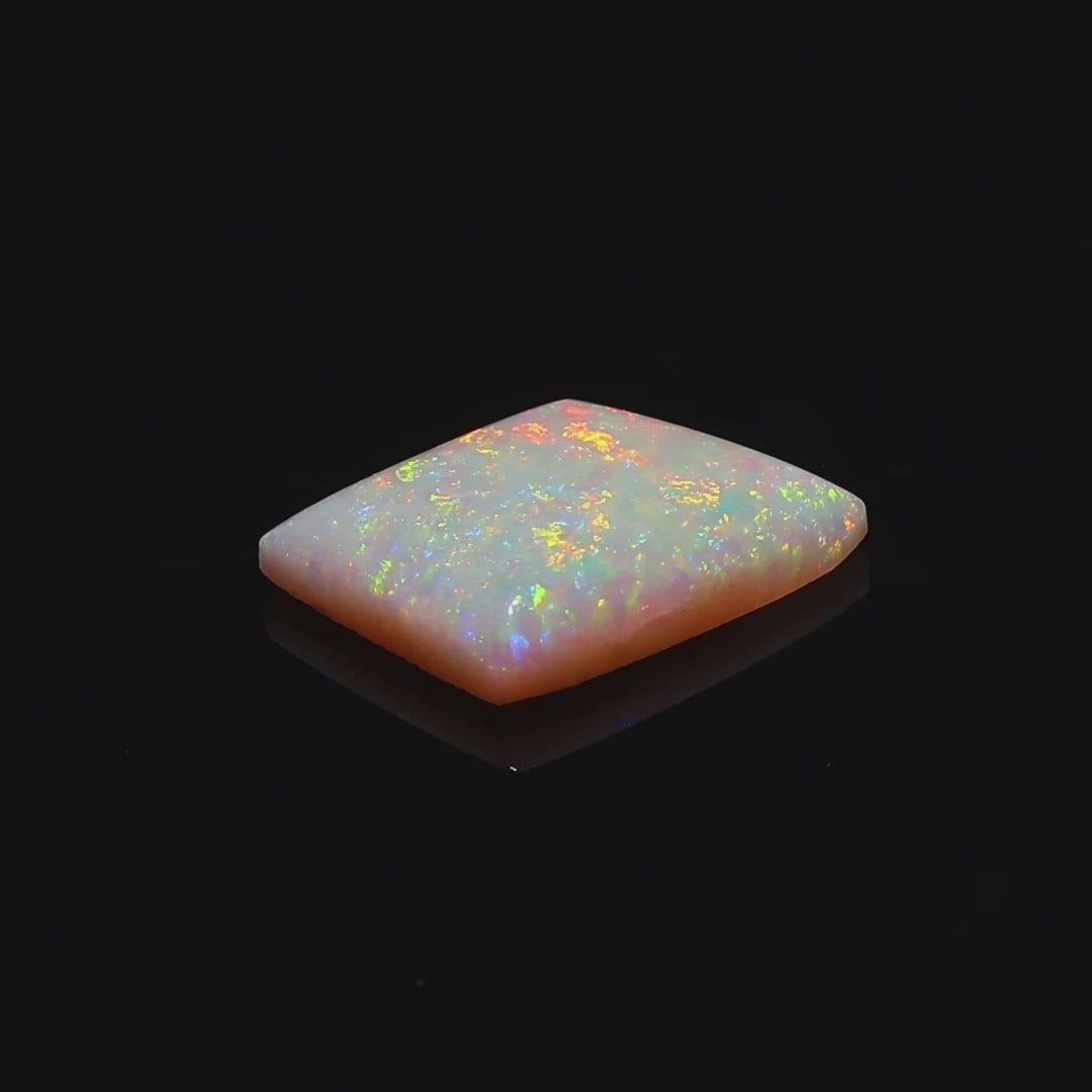 This 3.46-carat Andamooka Opal radiates a breathtaking rainbow spectrum, showcasing vibrant flashes of red, orange, yellow, green, and blue across its finely polished surface. Its distinct square cushion cut enhances the gem's play-of-color, making it a visually striking and unique opal.