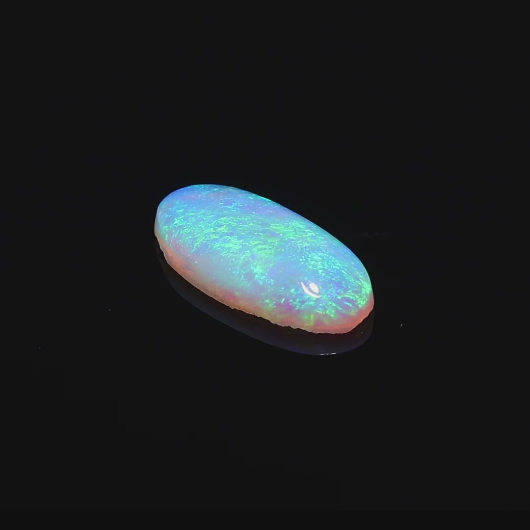 This 2.63-carat crystal black opal is a stunning creation from the world-renowned Lightning Ridge mines in Australia. Its surface displays a dynamic play-of-color, showcasing a vibrant rainbow spectrum against a semi-translucent black crystal base. The blend of colors shifts enchantingly with every movement, creating a captivating visual experience.