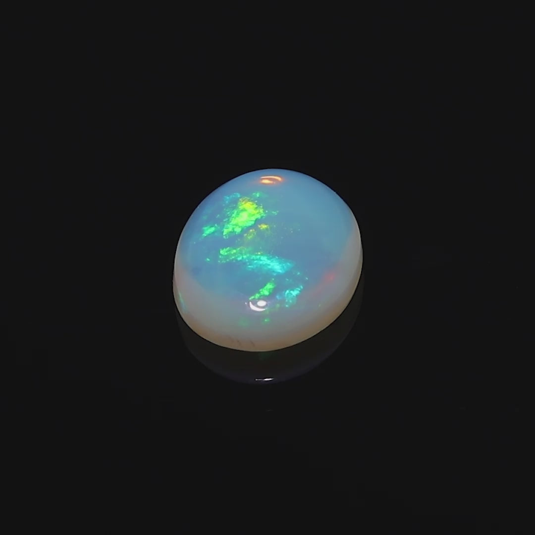 This stunning 2.39-carat black opal hails from the world-famous Lightning Ridge region of Australia, celebrated for its exquisite opals. The gem features a vivid play of colors, including fiery red, orange, yellow, and green, which seem to dance across its polished surface.