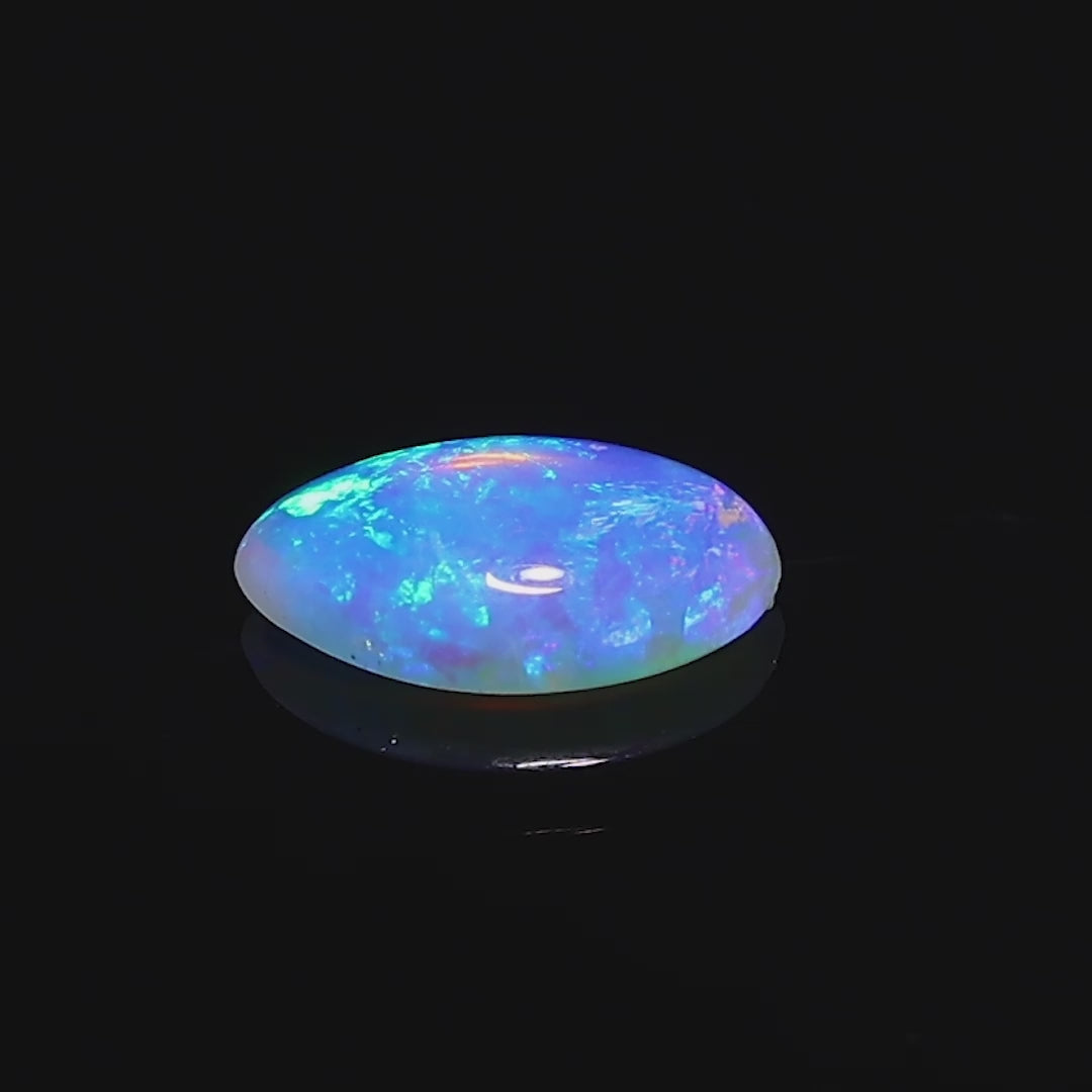 This exquisite 1.67-carat black opal, sourced from the renowned Lightning Ridge, features a captivating play-of-color in shades of green, blue, and violet. Its smooth, polished surface enhances its vibrant hues, offering an otherworldly glow that changes with every angle.