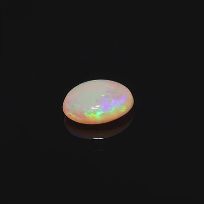This exquisite 1.27-carat black opal from Lightning Ridge showcases a vivid rainbow play-of-color. Its captivating hues shimmer across the gemstone, revealing flashes of green, violet, orange, and yellow under light. The black opal's smooth, polished surface highlights its natural depth and brilliance.