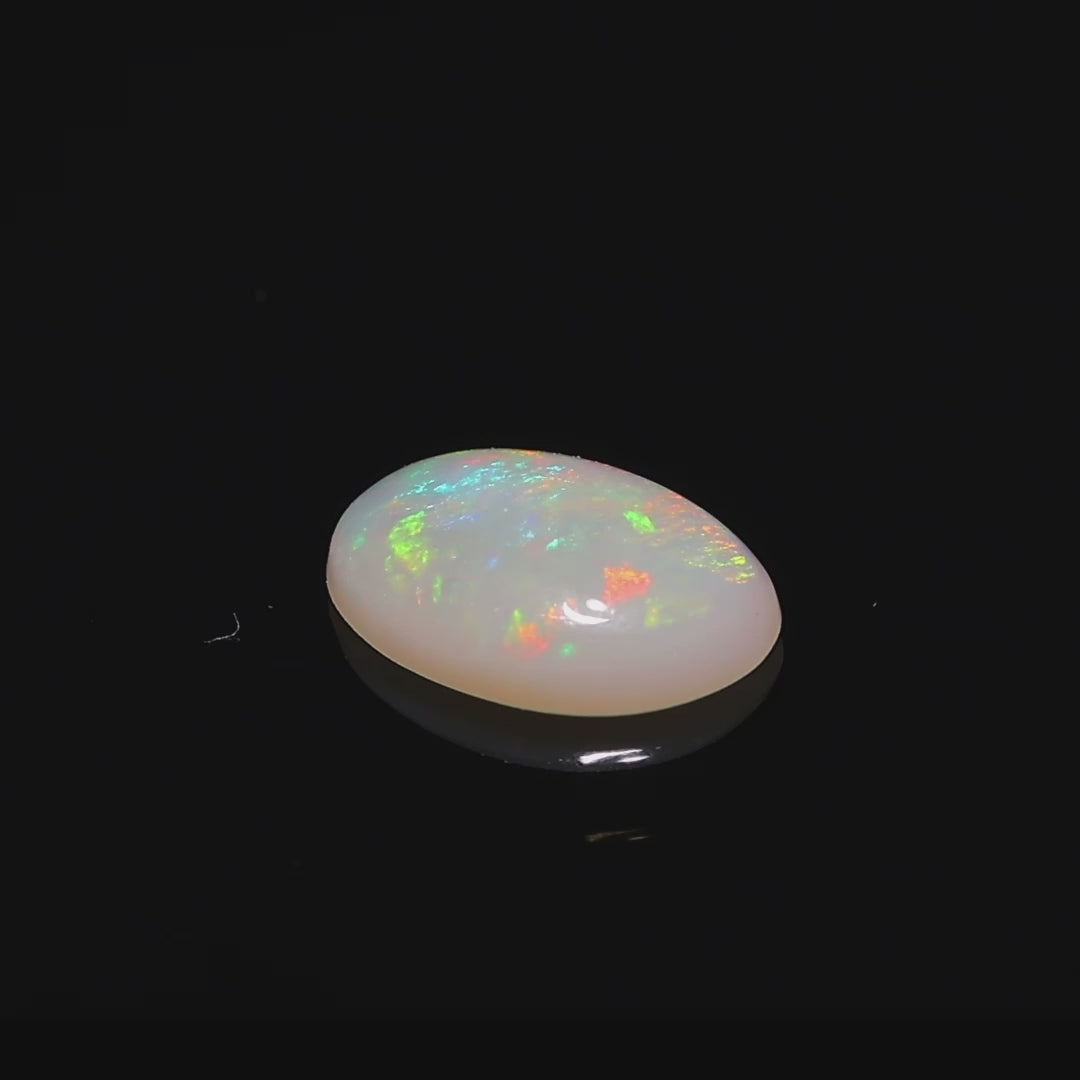 This dazzling 0.83-carat black opal is a true gem from Lightning Ridge, Australia, renowned for its world-class opals. It features a radiant play-of-color, showcasing a vibrant rainbow spectrum of reds, greens, blues, and yellows. The captivating brilliance of this opal is complemented by its smooth, polished surface, which enhances the stone's natural beauty.