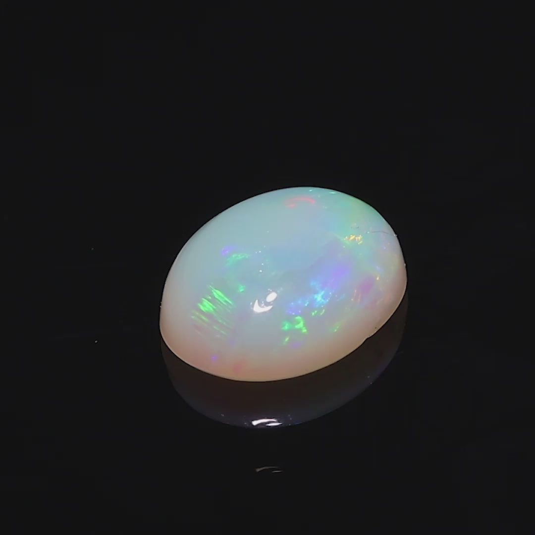 This 1.16-carat opal from Andamooka, Australia, showcases a mesmerizing rainbow play-of-color. The vibrant hues of green, blue, violet, and subtle flashes of red dance across its surface, offering a captivating display of nature’s artistry.
