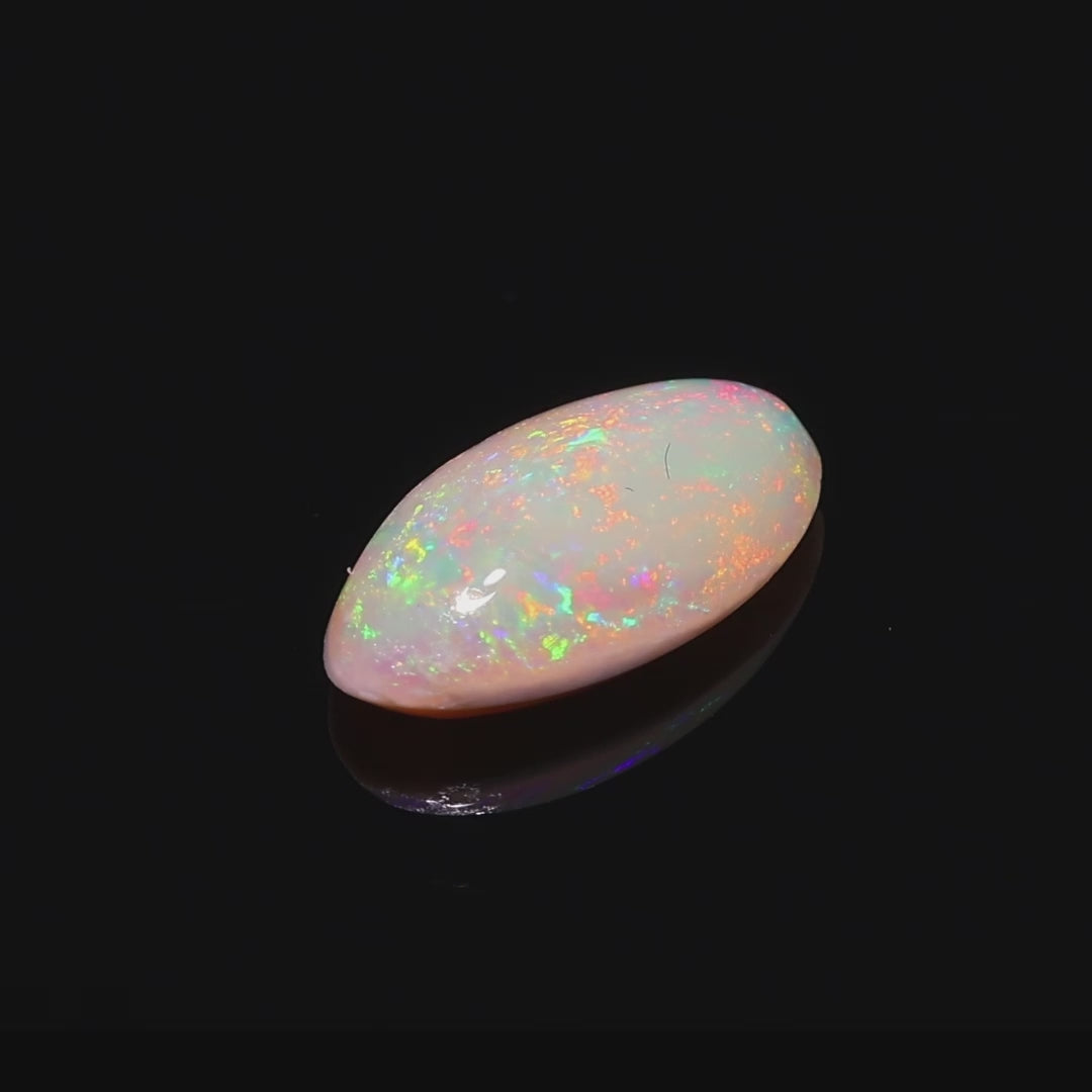 This opal, weighing 1.32 carats, hails from the renowned Andamooka fields in Australia. Its striking play-of-color showcases a radiant spectrum of hues, including fiery reds, vibrant oranges, shimmering greens, and soft blues, all glowing against a smooth, polished surface.