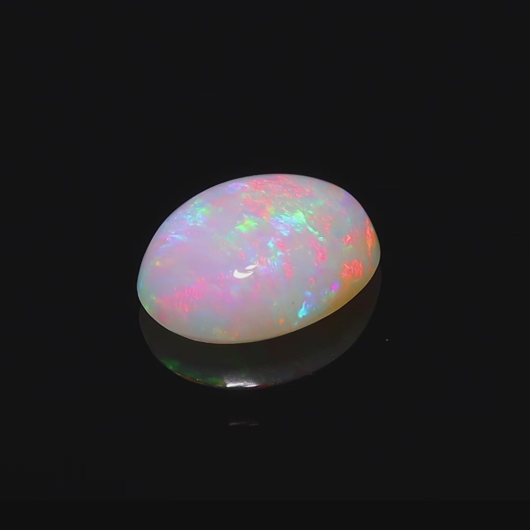 This stunning 1.67-carat opal from the Andamooka region in Australia is a brilliant display of nature's artistry. With its rounded cabochon shape and smooth finish, the opal showcases a vivid rainbow play-of-color, featuring fiery flashes of red, green, orange, and blue.