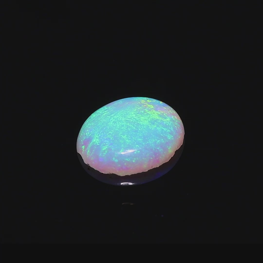 This stunning 0.87 Ct. black opal from the renowned Lightning Ridge mines showcases a captivating rainbow spectrum of colors. Its vibrant hues seamlessly blend across the gem’s smooth, rounded surface, creating a magical display of play-of-color that is characteristic of premium Australian opals.