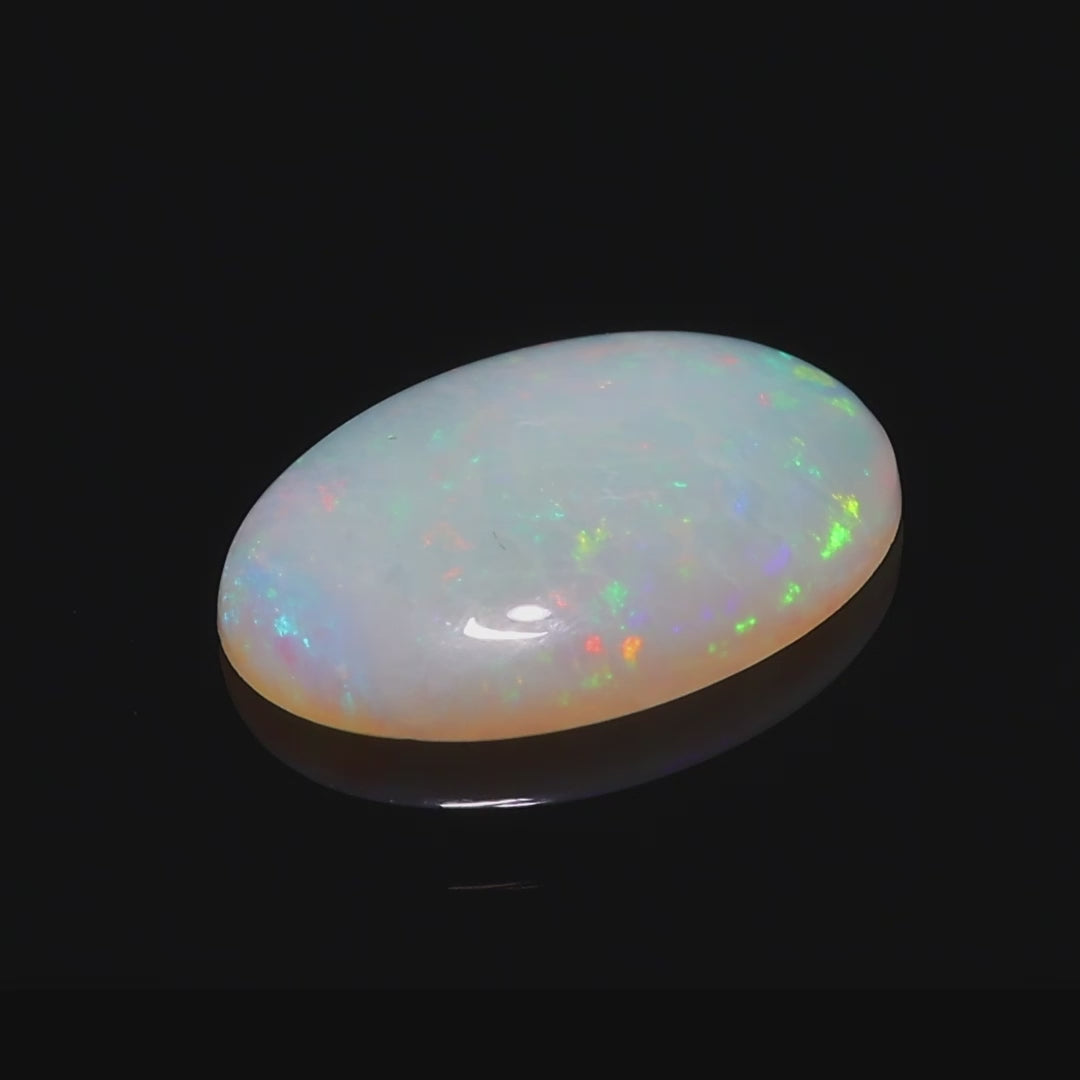 This captivating 2.21 Ct. opal hails from the renowned Andamooka fields of Australia, showcasing a mesmerizing rainbow play-of-color. Its light, creamy body tone is the perfect canvas for the vivid flashes of green, red, orange, and blue that dance across its polished surface.