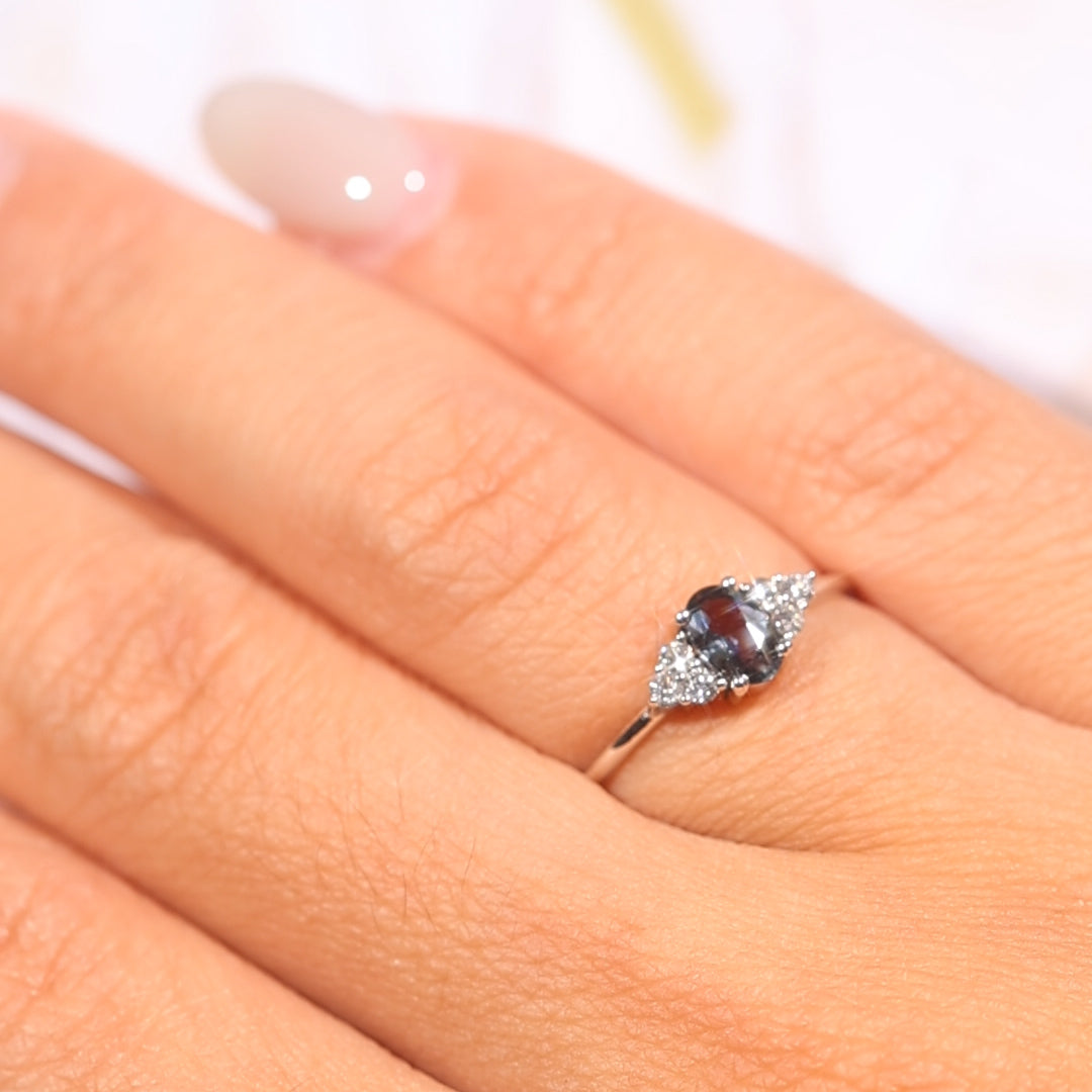 At the heart of this ring sits a richly toned oval-cut purple sapphire, its natural beauty enhanced by clusters of round brilliant diamonds on each side. Set in polished 18K white gold, the design blends strength with softness — a silhouette of graceful contrast.