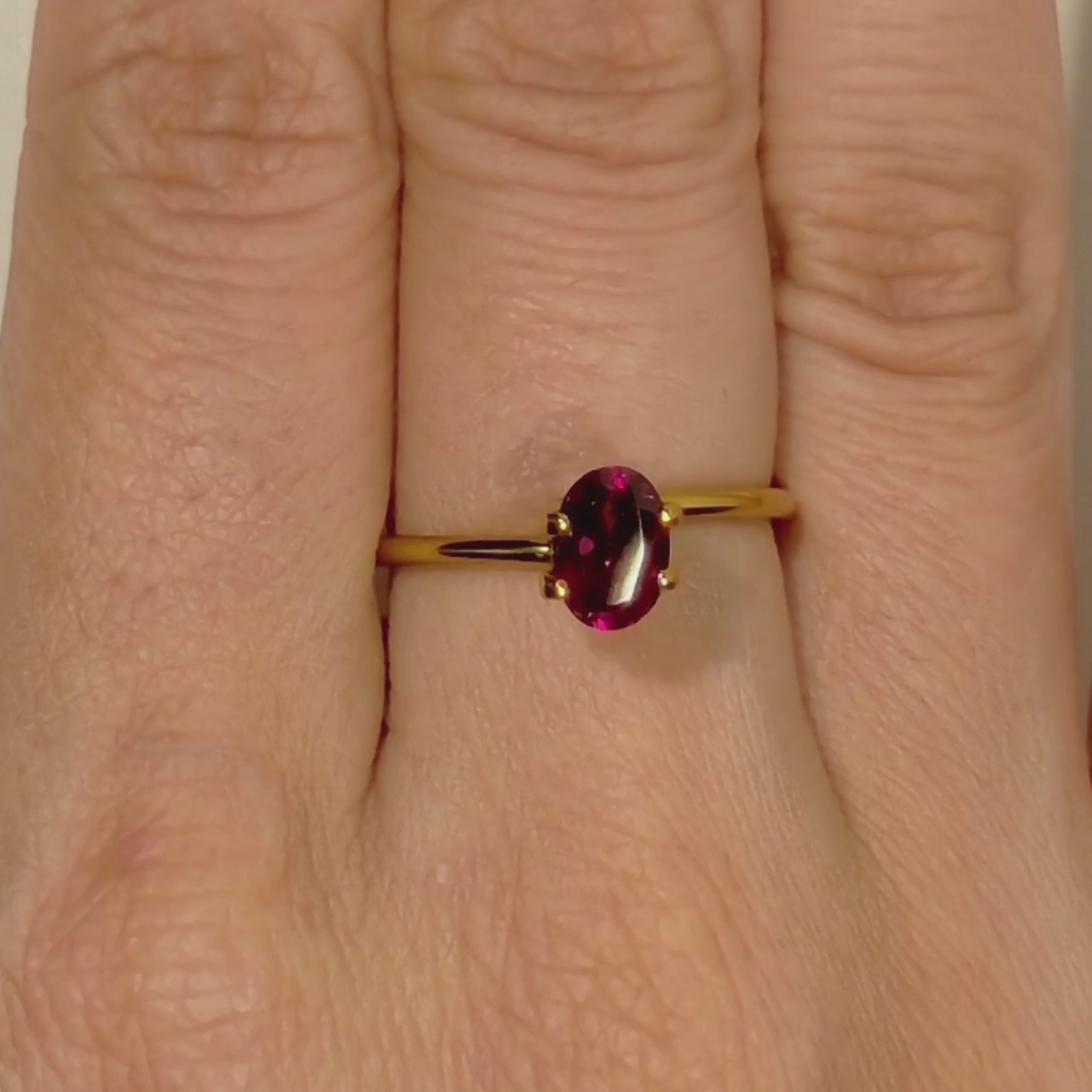 A captivating gemstone in a vivid raspberry-plum hue, this 1.26 carat rhodolite features a beautifully faceted oval cut that enhances its natural brilliance. The rich tone dances between berry and wine under changing light, offering a romantic yet bold allure.