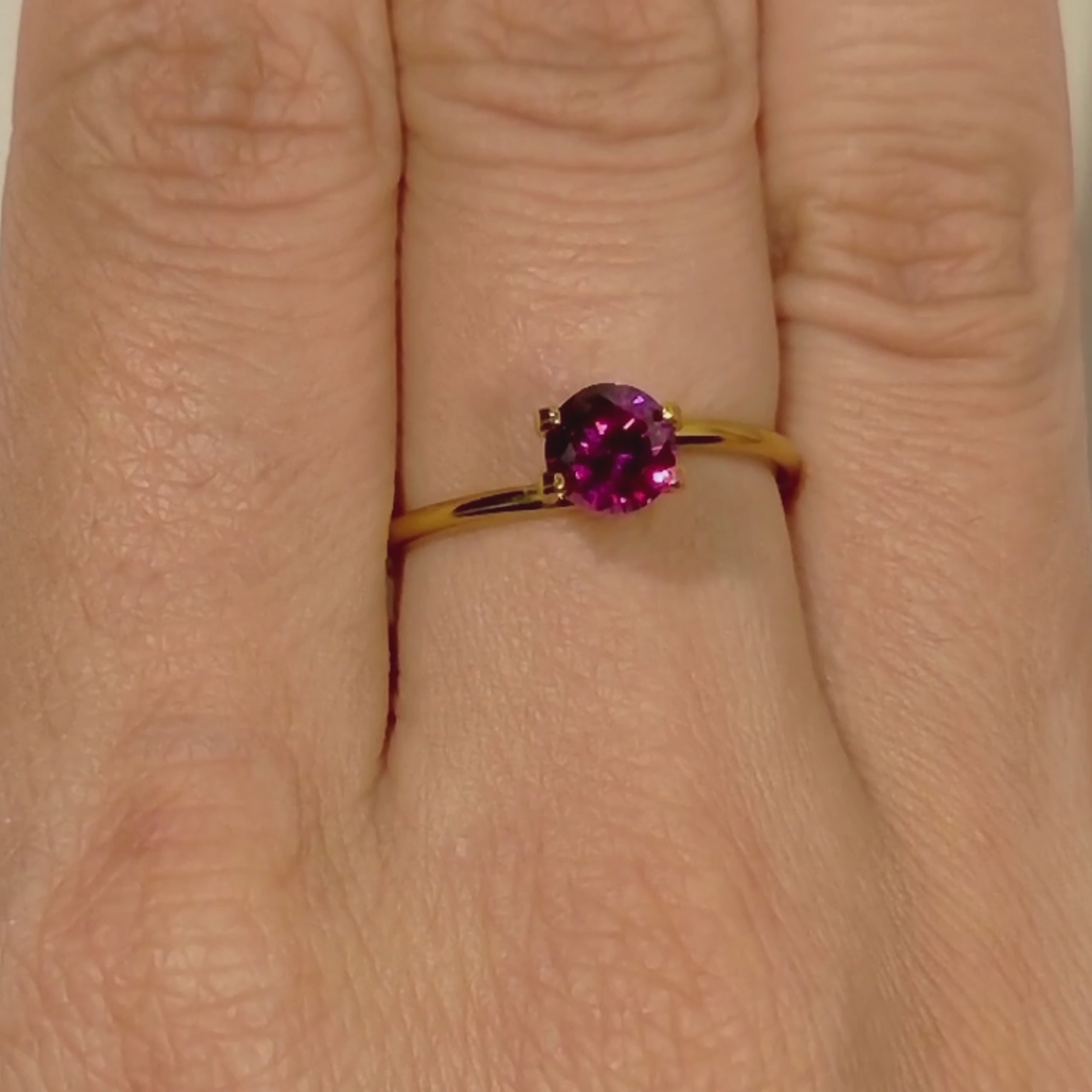 A charming burst of berry brilliance, this 0.89-carat round-cut rhodolite glows with deep rose and raspberry undertones. Its precision-cut facets reflect light in all the right places, revealing flashes of magenta and violet with every tilt. Petite yet striking, this gem is a vibrant choice for a delicate yet vivid centerpiece in a ring or pendant.