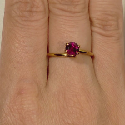 A captivating gem with a rich raspberry-plum hue, this 0.77-carat round rhodolite radiates vivid magenta tones and intense inner glow. Its lively brilliance and balanced proportions make it an elegant choice for a ring or pendant that exudes confident charm. The deep, velvety colour and fine polish reveal the natural beauty of this rare gemstone.