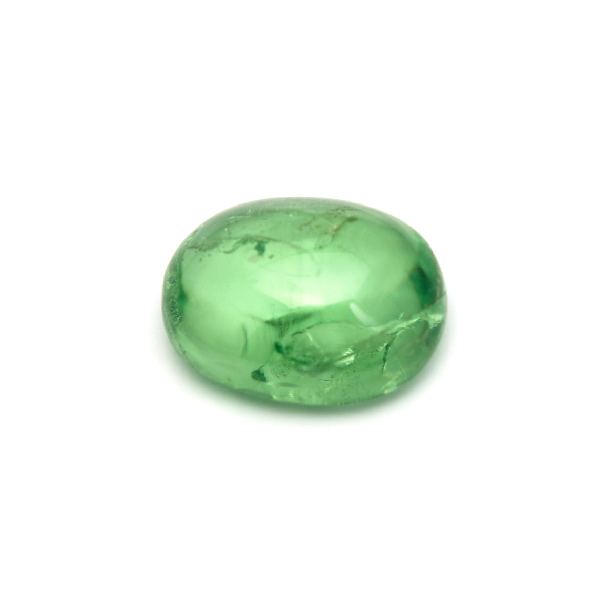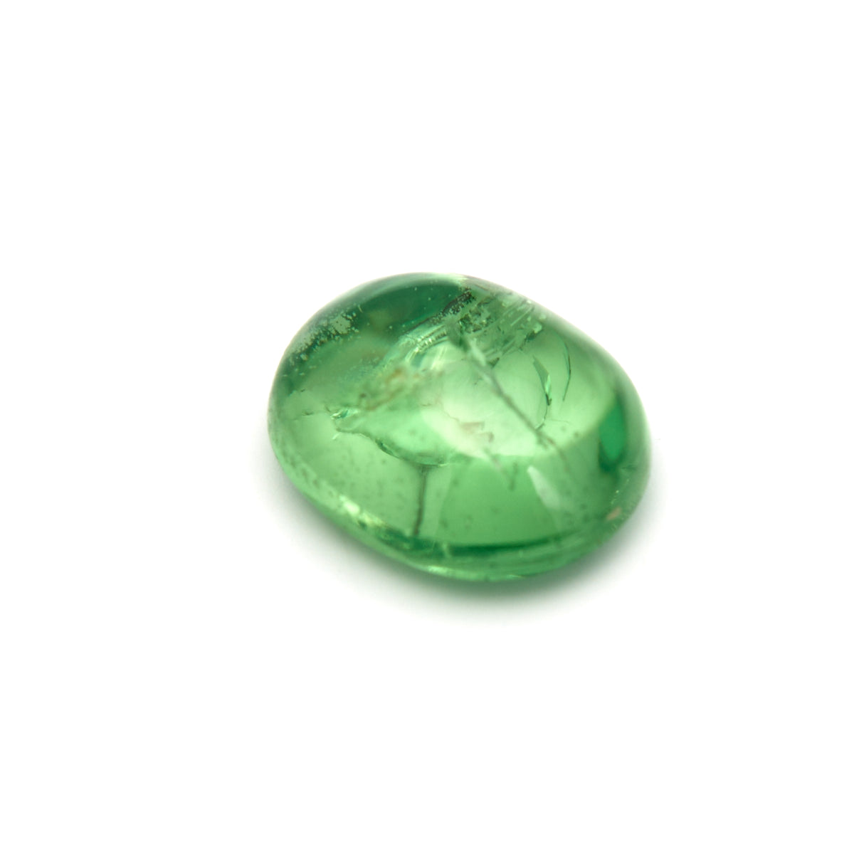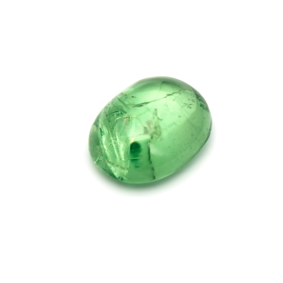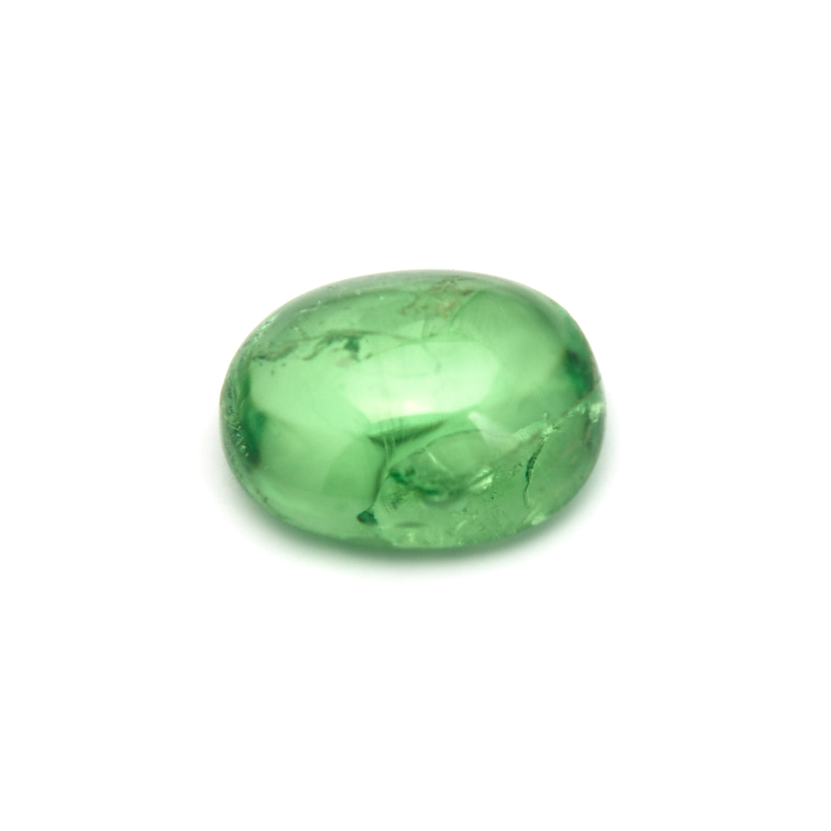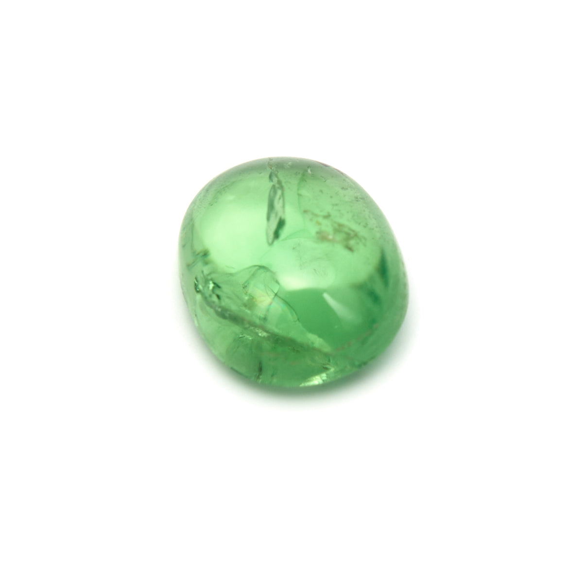 A soft, glowy green emerges from this 1.54 carat Tanzanian tsavorite cabochon. Its gentle domed surface reveals a watery translucence with intriguing internal textures that speak to its natural origin. A serene gem ideal for minimalist designs or as a center stone in an organic, artistic setting.